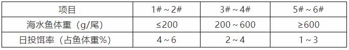 ? 根據(jù)網(wǎng)箱或池塘中海水魚規(guī)格及數(shù)量,參考投餌參考表中推算投餌量,再根據(jù)天氣、水溫、水質(zhì)、海水魚攝食及健康狀況等予以適當(dāng)調(diào)整。