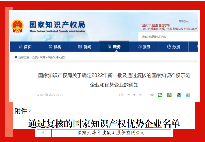 天馬科技訊 近日,國(guó)家知識(shí)產(chǎn)權(quán)局公示了2022年國(guó)家知識(shí)產(chǎn)權(quán)優(yōu)勢(shì)企業(yè)和示范企業(yè)評(píng)定結(jié)果。天馬科技集團(tuán)憑借在知識(shí)產(chǎn)權(quán)創(chuàng)造能力、科技創(chuàng)新、管理水平、產(chǎn)品工藝等方面取得的突出成績(jī),再度獲評(píng)2022年度“國(guó)家知識(shí)產(chǎn)權(quán)優(yōu)勢(shì)企業(yè)”。