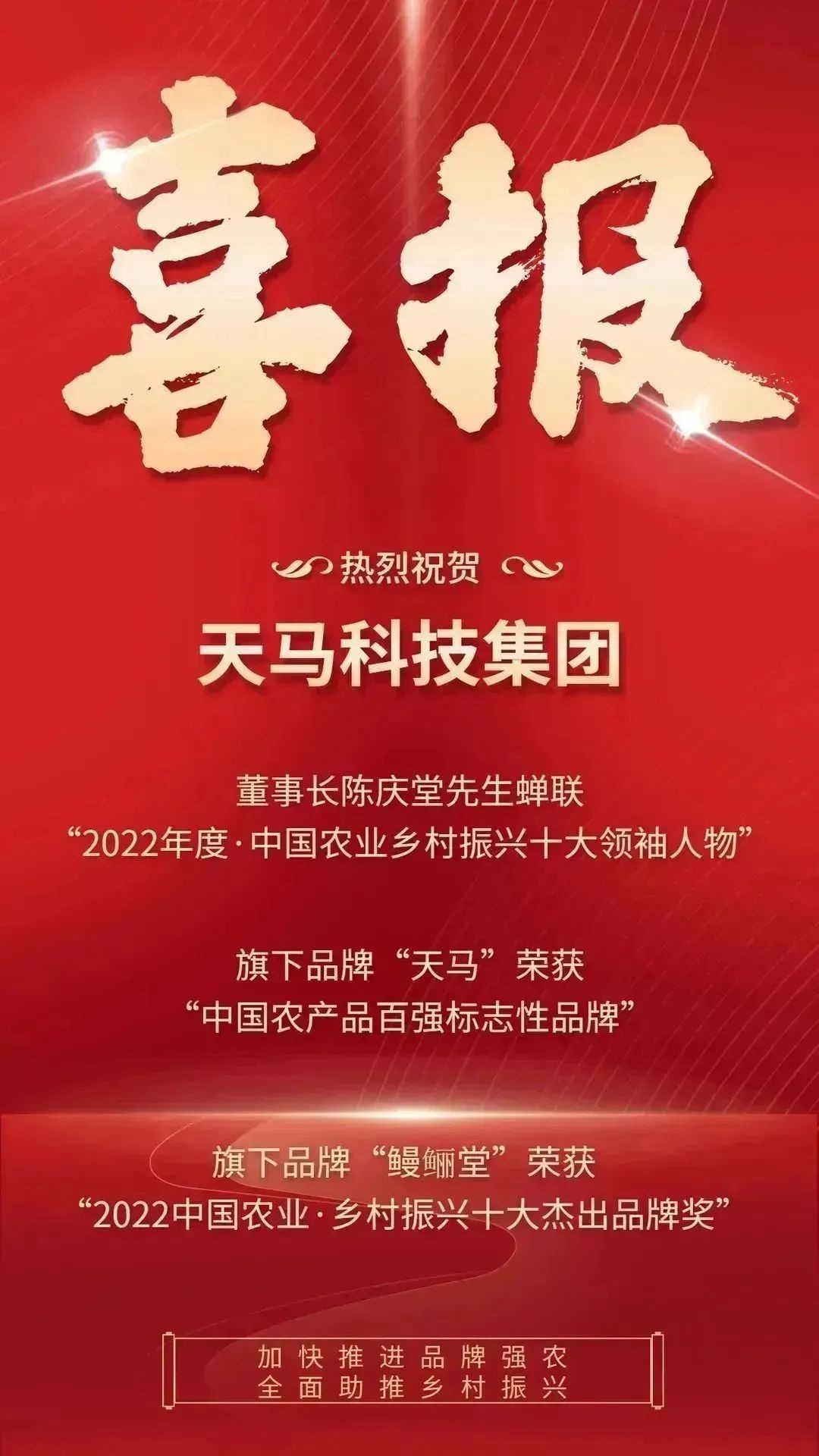 天馬科技訊 12月16日,以“賦能鄉(xiāng)村振興 建設(shè)農(nóng)業(yè)強國”為主題的2022第八屆中國農(nóng)業(yè)品牌年度頒獎盛典隆重召開。天馬科技集團(tuán)董事長陳慶堂先生蟬聯(lián)“2022年度·中國農(nóng)業(yè)“鄉(xiāng)村振興十大領(lǐng)袖人物”、集團(tuán)旗下品牌“天馬”榮獲“中國農(nóng)產(chǎn)品百強標(biāo)志性品牌”、集團(tuán)旗下品牌“鰻鱺堂”榮獲“2022中國農(nóng)業(yè)·鄉(xiāng)村振興十大杰出品牌獎”,以三項大獎在年末交出品牌建設(shè)完美答卷!