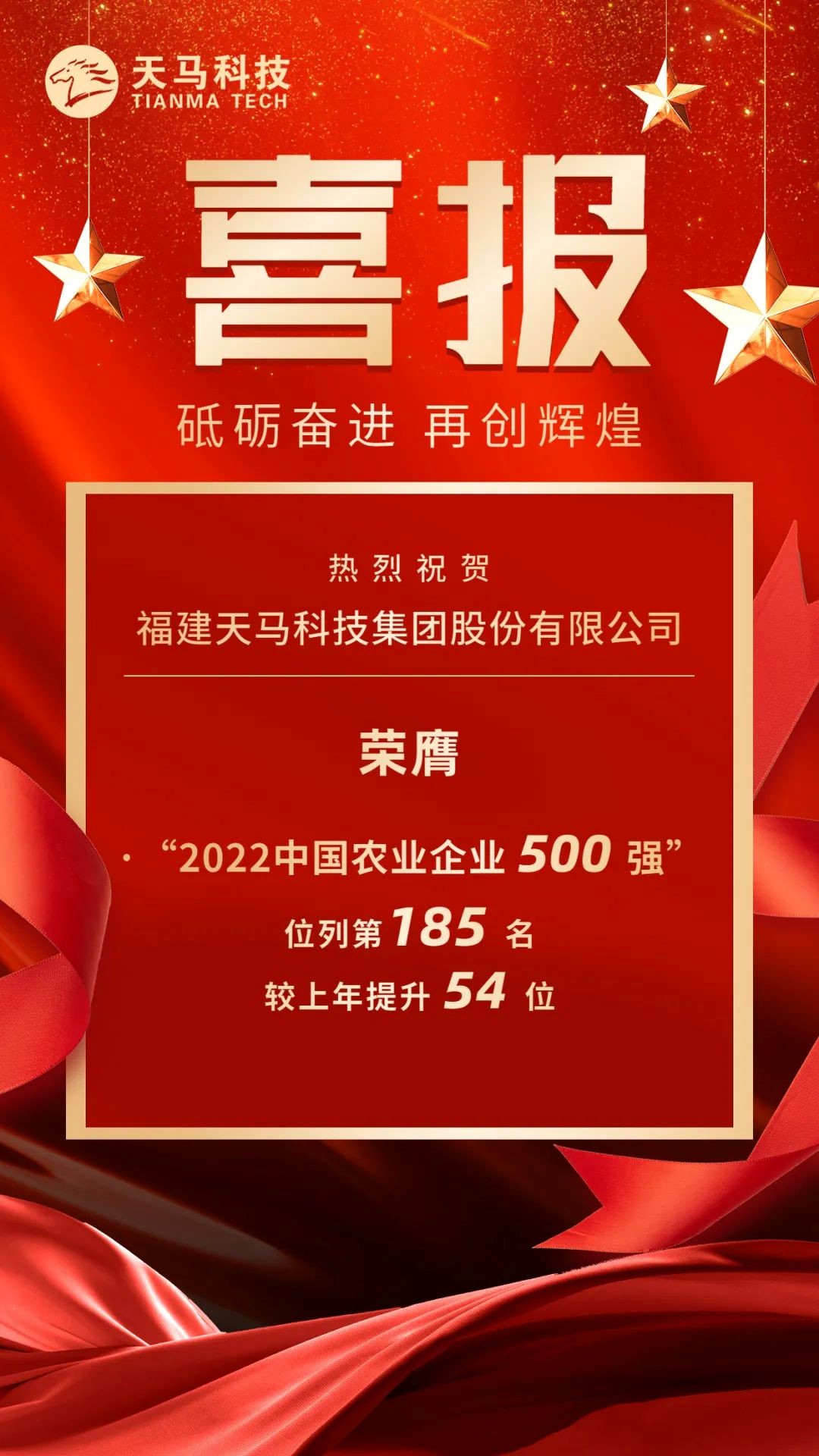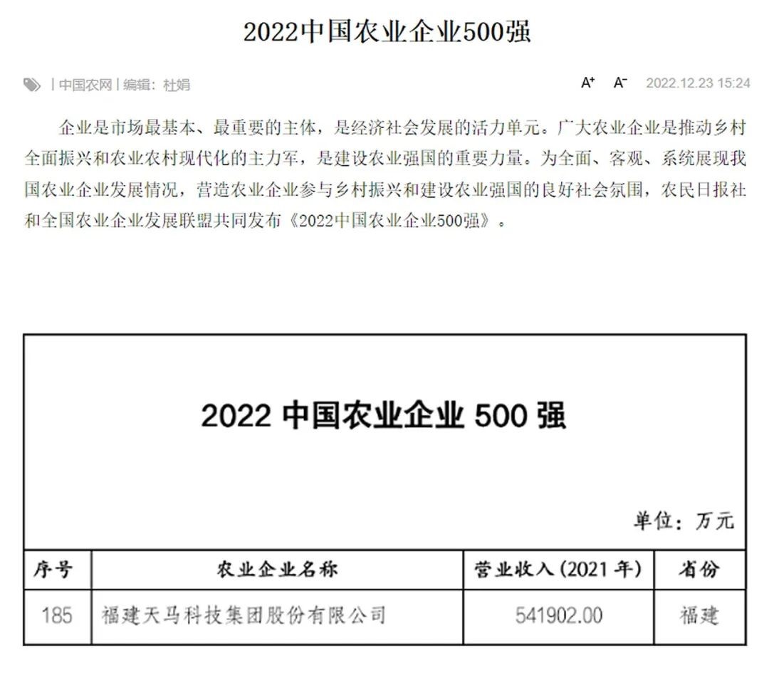 天馬科技訊 近日,由農民日報社組織評定的2022中國農業(yè)企業(yè)500強(第五屆)正式發(fā)布,天馬科技集團蟬聯(lián)中國農業(yè)企業(yè)500強!