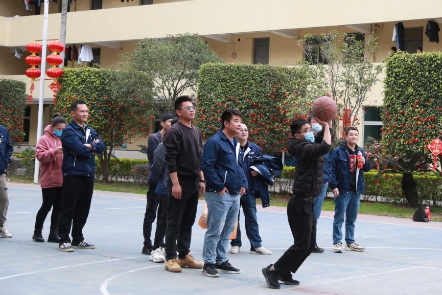 在投籃游戲現(xiàn)場,員工雙膝輕輕彎曲,雙手托著籃球,然后猛然起跳,在跳的一瞬間一投,籃球乖乖地進了籃筐。現(xiàn)場歡呼聲接連不斷,熱鬧非凡。
